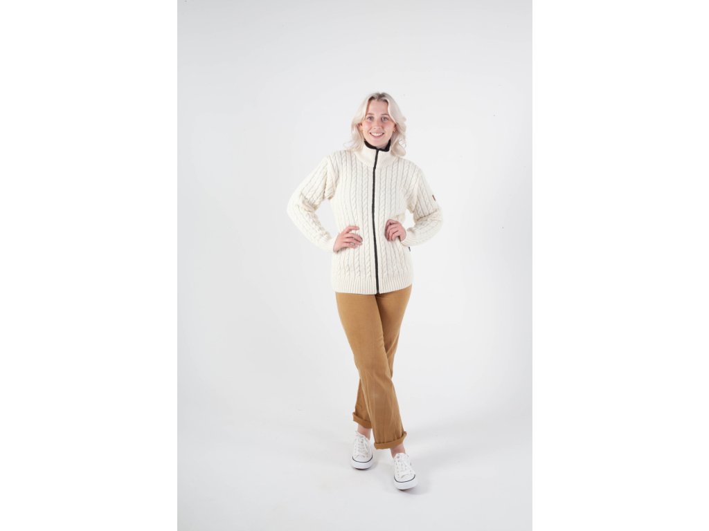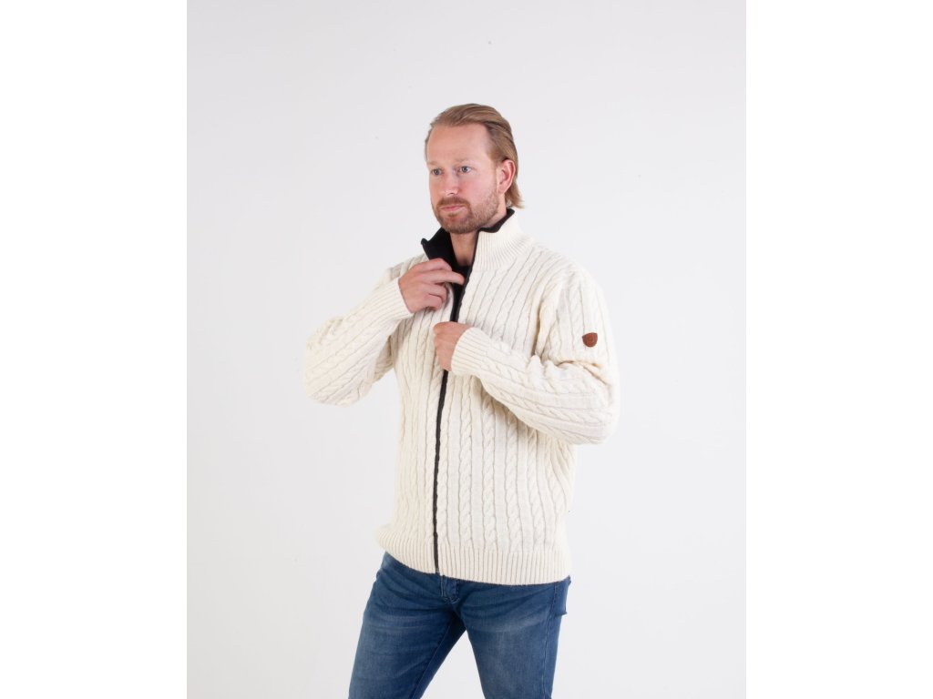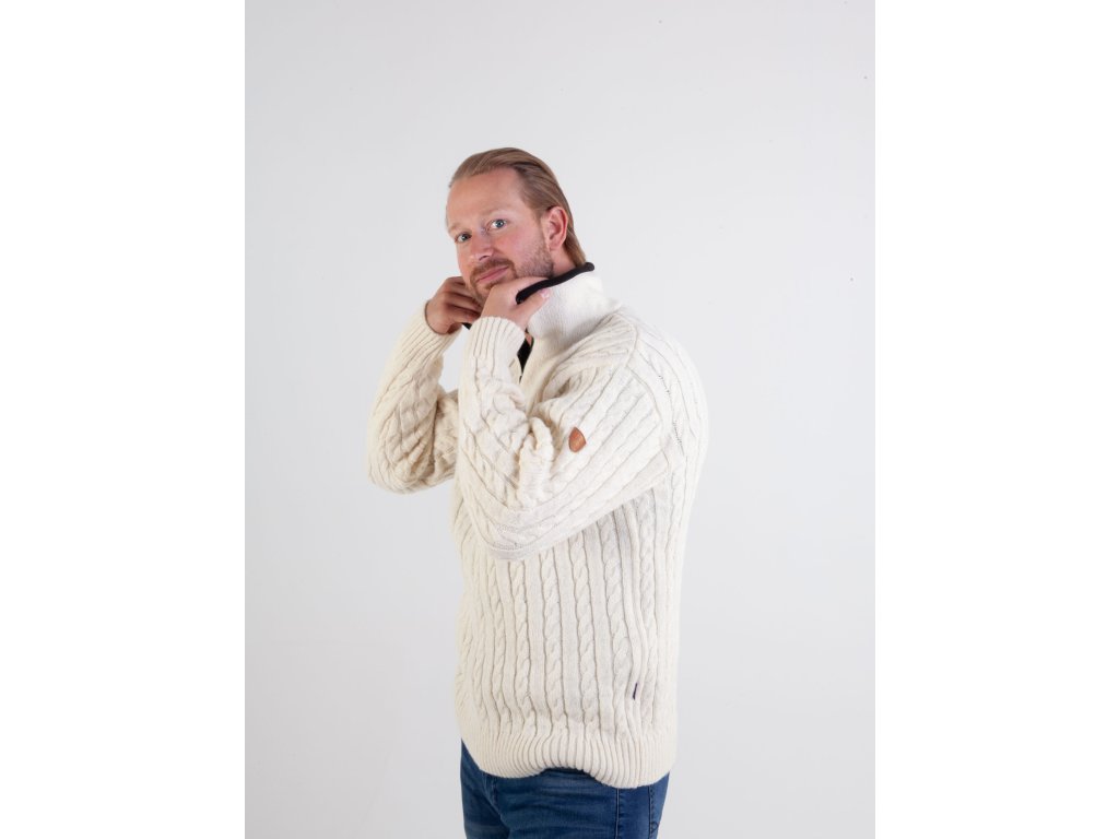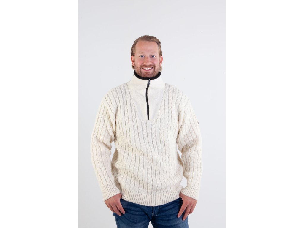 Material: 100% lână norvegiană + guler căptușit cu fleece; Culoare: alb crem (off white), tiv negru la guler; Închidere: fermoar din plastic - pe toată lungimea puloverului; Mărimi disponibile: M - 2XL; Potrivit pentru: bărbați și femei; Greutate: 0,775 kg