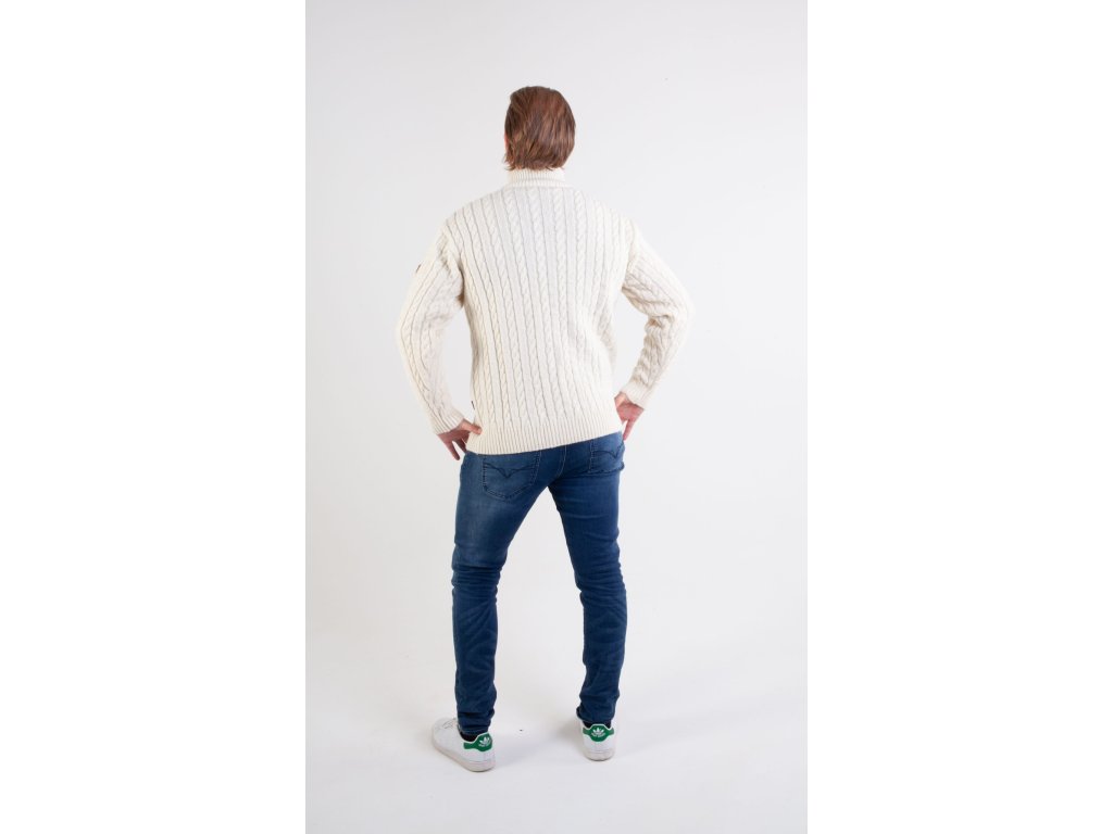 Puloverul din lână HOLMSBU este destinat atât femeilor, cât și bărbaților. Puloverele norvegiene sunt cunoscute pentru caracterul lor universal și sunt fabricate în variantă unisex. Motivul colorat al puloverului constă în baza de culoare alb crem. Pe întreaga suprafață a puloverului se află un model împletit. Puloverul de iarnă este prevăzut cu un guler înalt de aproximativ 9 cm. Gulerul înalt este confecționat din fleece pe interior și din lână pe exterior. Datorită combinației de fleece și lână, puloverul asigură o senzație plăcută de căldură în zona gâtului. Gulerul înalt este prevăzut cu un fermoar din plastic, astfel încât puloverul poate fi desfăcut.