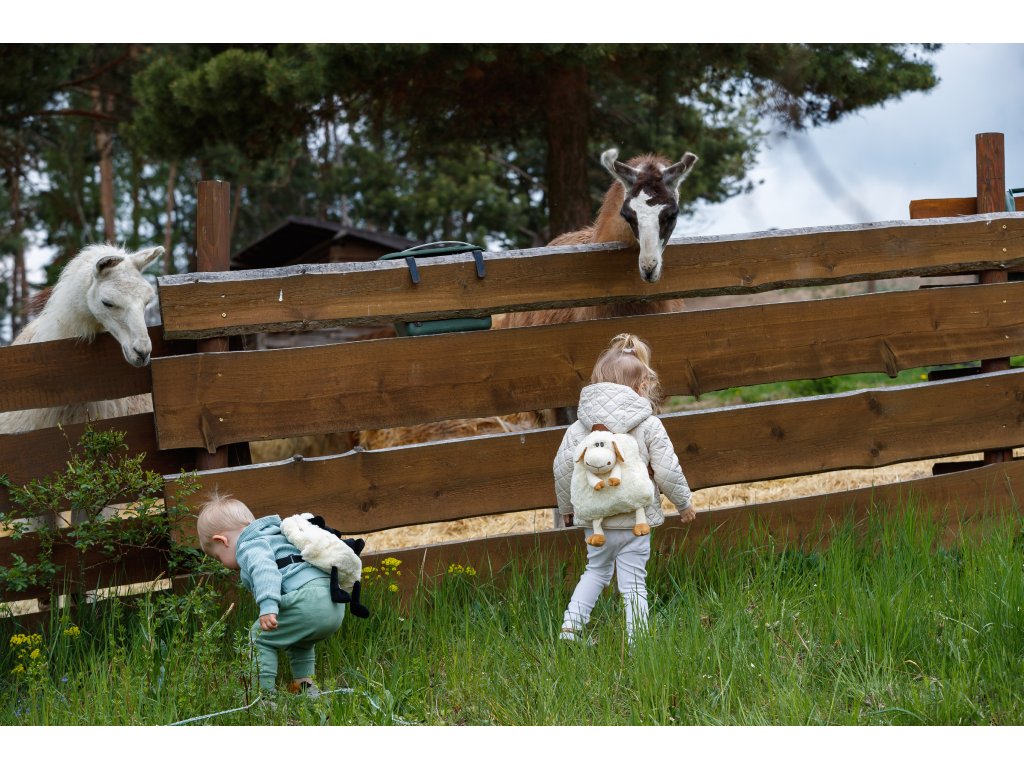 Rucsacul pentru copii în formă de oaie este fabricat din pluș. Rucsacul este destinat copiilor începând de la vârsta de 3 ani. Este foarte popular, de exemplu, pe post de rucsac pentru grădiniță.