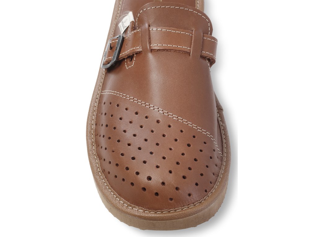 Sandalele din piele pentru bărbați, de culoare maro, sunt destinate utilizării atât în casă, cât și în exterior. Sandalele din piele sunt excepționale prin designul lor simplu și rafinat. Papucii sunt de tip slip-on, cu vârful închis. Papucii sunt perforați în partea din față, ceea ce îi face mai respirabili.