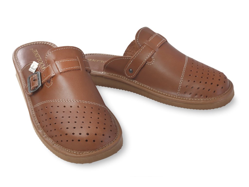 Papucii din piele pentru bărbați sunt un tip de încălțăminte potrivit în special pentru sezonul de primăvară și vară. Suprafața exterioară a sandalelor pentru bărbați este realizată din piele, într-o culoare maro atemporală. În timpul utilizării, încălțămintea nu se deformează, iar piciorul se potrivește perfect în ea. Sandale din piele sunt prevăzute cu găuri în partea superioară pentru o mai bună circulație a aerului. În partea superioară, încălțămintea este prevăzută cu o curea din piele pentru strângerea sau slăbirea papucilor în zona gleznei superioare.