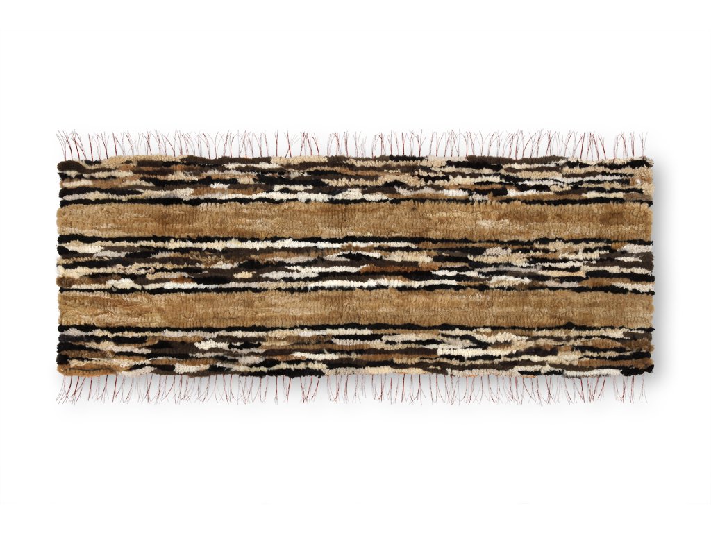 Covoare decorative țesute din materiale naturale, care vin într-un singur set. Acest set de covoare țesute originale și unice este format din trei piese în total. Covorul mare are dimensiunile de 160 x 200 cm, covorașele mici au dimensiunile de 60 x 160 cm. Covoarele sunt țesute din mai multe tipuri de piei colorate. Covorul alternează benzi de blană maro deschis, maro închis și alb. Deoarece este un produs unic, combinația de culori este diferită. Impresia generală a acestui set de covoare țesute este unică și deosebită. Datorită metodei de țesere utilizate, covorul are un aspect tradițional. Covorul combină elemente de culoare închisă cu elemente de culoare deschisă. Astfel, acesta este un accesoriu original și unic pentru orice interior. Execuția este foarte precisă și fiecare piesă este un original, care poate fi expus frumos în sufragerie, holul spațios sau în dormitor.