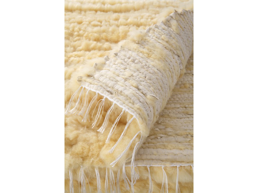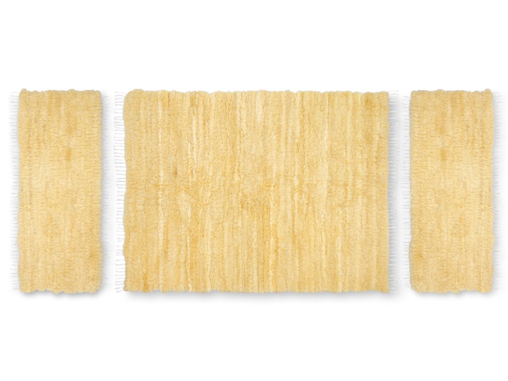 Covoare decorative țesute din materiale naturale, care vin într-un singur set. Acest set de covoare țesute originale și unice este format din trei piese în total. Covorul mare are dimensiunile de 160 x 200 cm, covorașele mici au dimensiunile de 60 x 160 cm. Covoarele sunt țesute din bucăți monocrome de piele galbenă. Impresia generală a acestui set de covoare țesute este unică și unicat. Datorită metodei de țesere utilizate, covorul are un aspect tradițional. Astfel, este un accesoriu original și unic pentru orice interior. Execuția este foarte precisă și fiecare piesă este un original, care poate fi expus frumos în sufragerie, holul spațios sau în dormitor. Piele de oaie tratată pentru a fi potrivită pentru alergici,