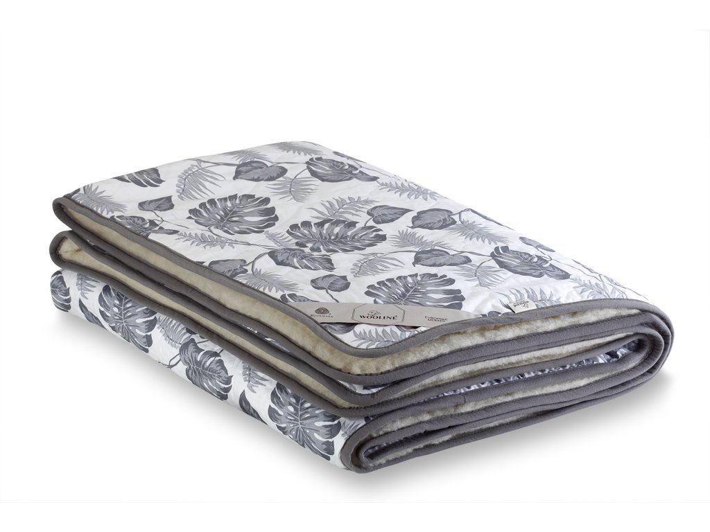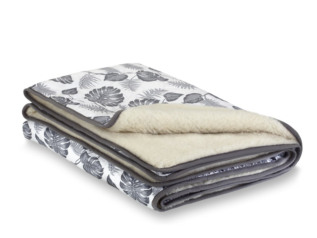Material: 100% merinos european / 100% bumbac imprimat cu motive florale Monstera, Design: reversibil - partea din spate are un suport alb imprimat în gri, partea din spate este o culoare solidă în crem deschis. Acest design este același pentru pături și perne. Dimensiune: pătură 140 x 200 cm, pernă 40 x 60 cm, Umplutura pernei: 100% lână de oaie, Greutate: 3 kg (pătură plus pernă), Greutate: 450g/m2