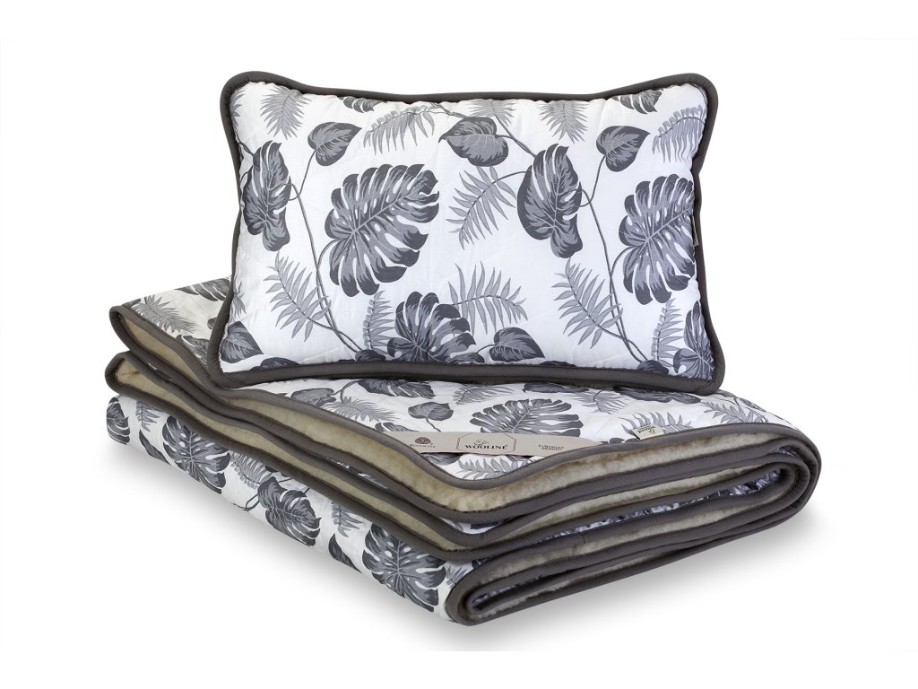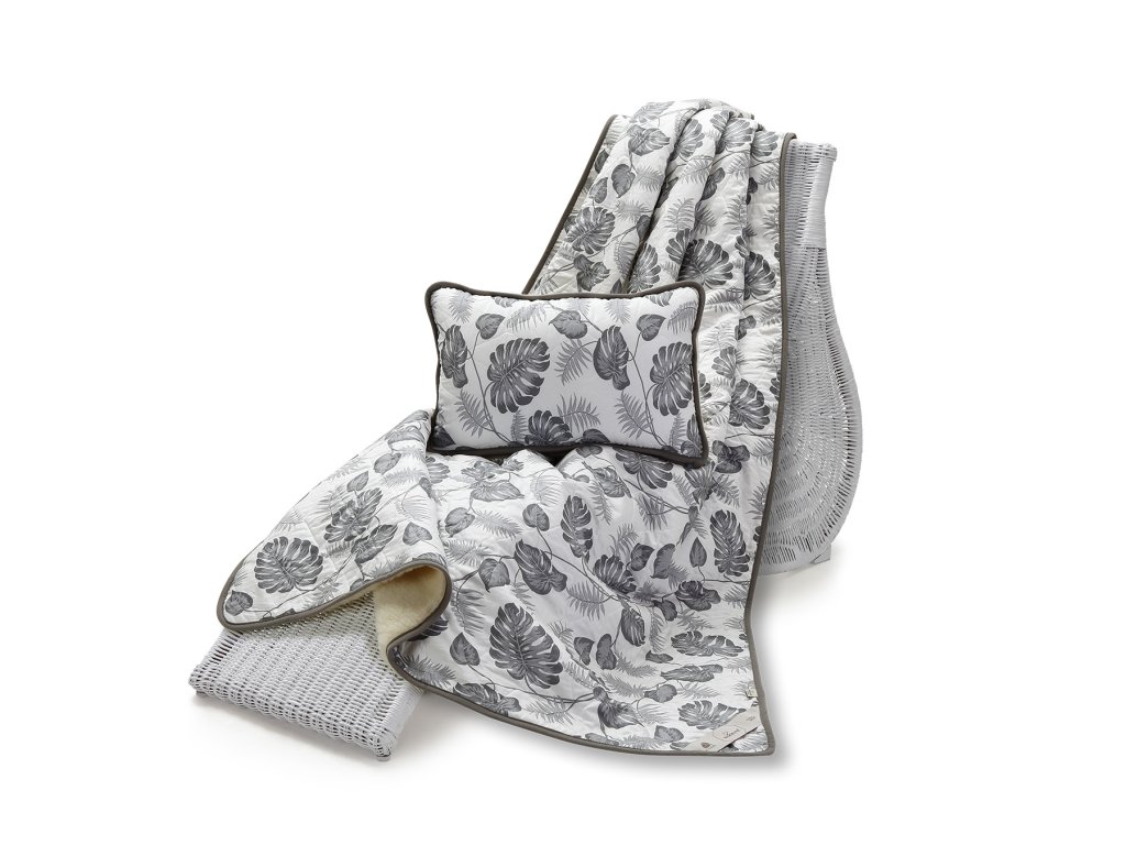 Partea exterioară este fabricată din 100% bumbac. Acest material este unic prin delicatețea și moliciunea sa. Schema de culori este o bază albă cu un imprimeu elegant și distinctiv cu frunze de flori Monstera în gri deschis. Atât cuvertura de lână, cât și perna sunt pe perimetrul lor cu o margine gri închis, care este foarte bine întărește marginile și previne lipirea îmbinărilor produselor.