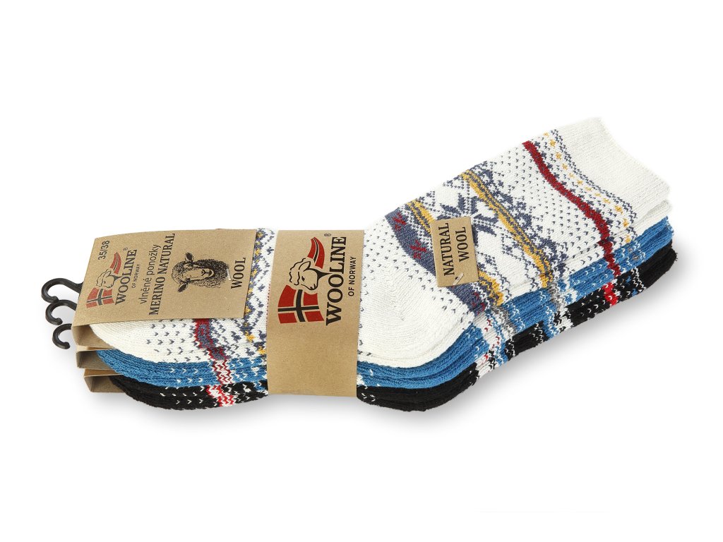 Set de șosete călduroase din lână Wooline Natur, tip de lână foarte fină și moale. Setul de șosete din lână conține 3 perechi de șosete cu diferite motive. Motivele corespund cu motivele din imaginea afișată. Datorită materialului utilizat, șoseta se adaptează la mărimea piciorului.