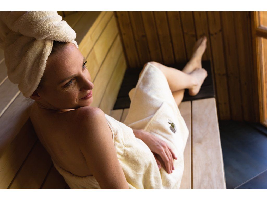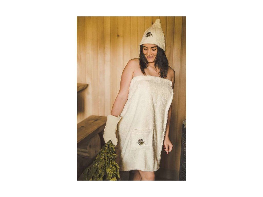 Material: 100% bumbac, Culoare: crem deschis, Dimensiune: 75 x 150 cm, Potrivit pentru: femei, Utilizare: accesorii pentru saună, Fixare: velcro