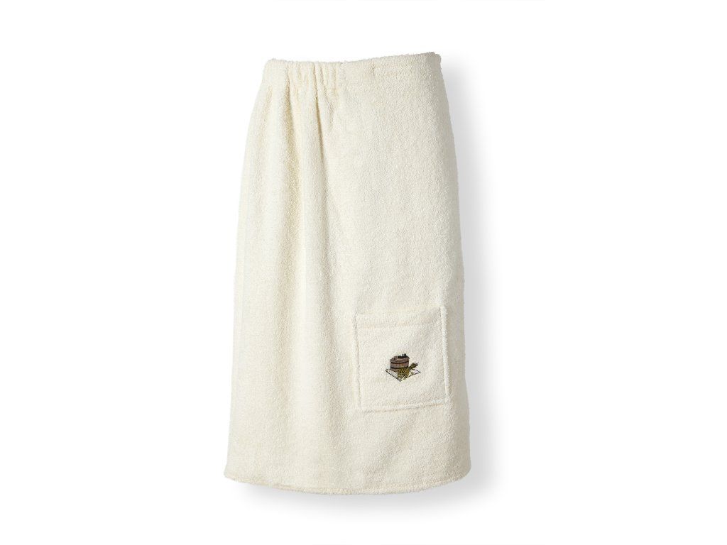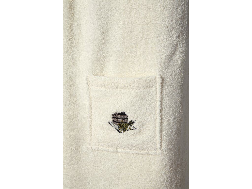 Materialul din bumbac frotte este foarte moale și plăcut la atingere. Acoperă perfect corpul și absoarbe excesul de umiditate. Avantajul utilizării este că, de exemplu, după ce intrați în saună, puteți desface șorțul și îl puteți folosi pe post de cearșaf pentru banca din saună și vă puteți așeza pe el. Șorțul este destinat utilizării în condiții de căldură intensă. Șorțul calitativ de saună, pentru femei, este prevăzut și cu un buzunar practic, în care vă puteți ascunde unele obiecte de valoare pe care doriți să le aveți la îndemână sau cheile. Buzunarul este situat în partea inferioară din față și este decorat cu o broderie în formă de găleată.