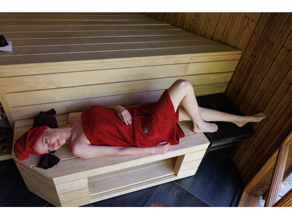 Material: 100% bumbac, Culoare: roșu închis, Dimensiune: 75 x 150 cm, Potrivit pentru: femei, Utilizare: accesorii pentru saună, Fixare: velcro